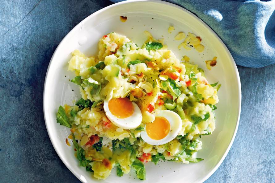 - Serveer de stamppot met de halve eieren en bestrooi met het amandelschaafsel.